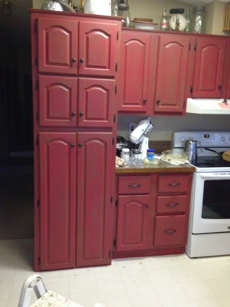 Two weekends ago, I painted. On Friday, I painted the primer. Two coats. On Saturday, I painted red. Two coats. (actually three on the cabinet doors.) I painted from 8 in the morning until after 9 p.m. both days. I held a brush so long that I had blisters!